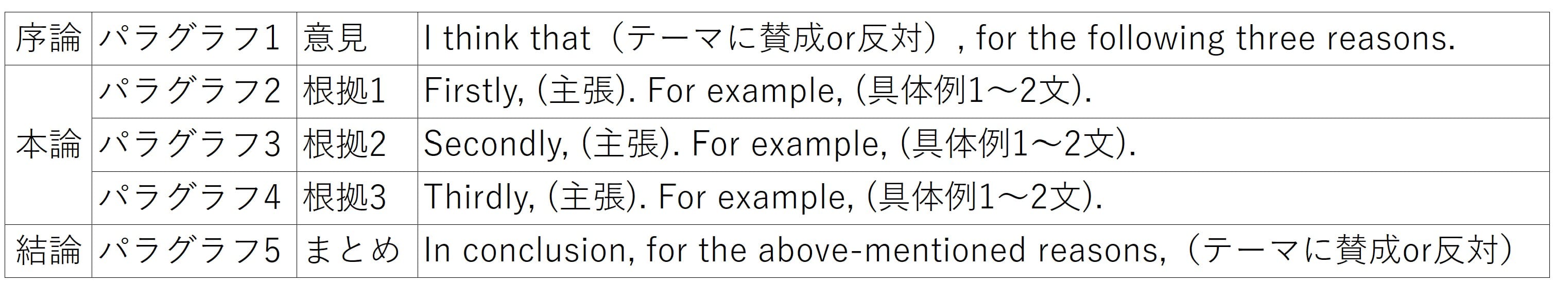 ・序論(introduction)、本論(main body)、結論(conclusion)の構成で書く
